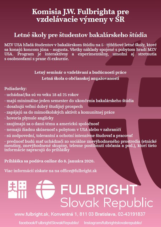 Letné školy sa konajú v termíne koniec júna – august 2020. Program uhrádza všetky náklady vrátane zdravotného pistenia, letenky a víz do USA.
