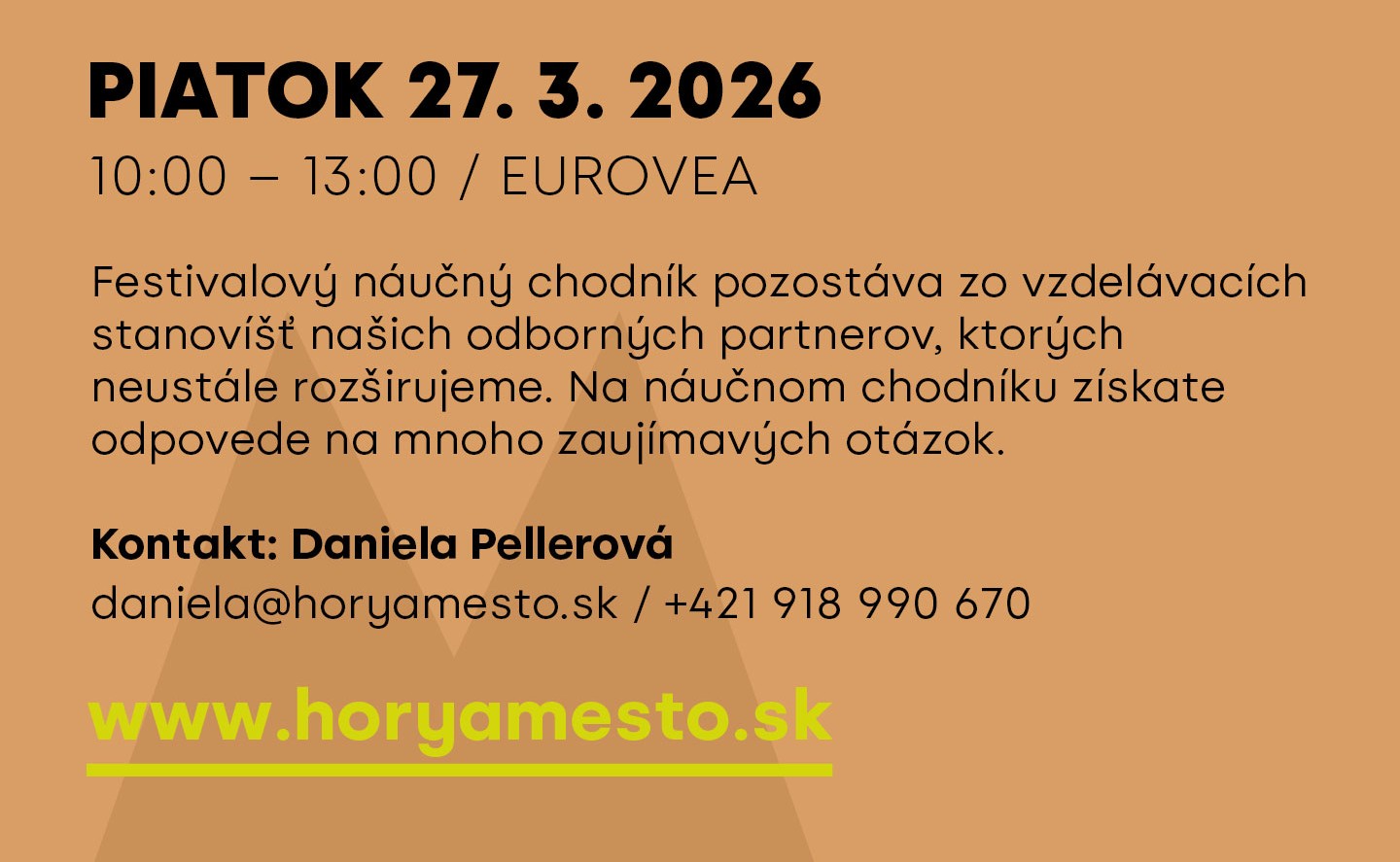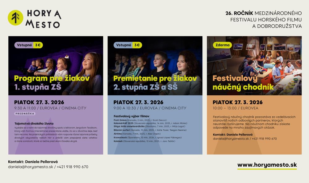 „Našim cieľom je osloviť aj mladú generáciu a deti. Sprostredkovať im autentické zážitky z expedícií a inšpirovať ich k zdravému životnému štýlu a ochrane životného prostredia. Navyše si často môžu na vlastnej koži otestovať aj svoje vedomosti a zručnosti,” hovoria organizátori festivalu Hory a mesto. Všetky sprievodné podujatia nájdete na oficiálnej stránke festivalu.