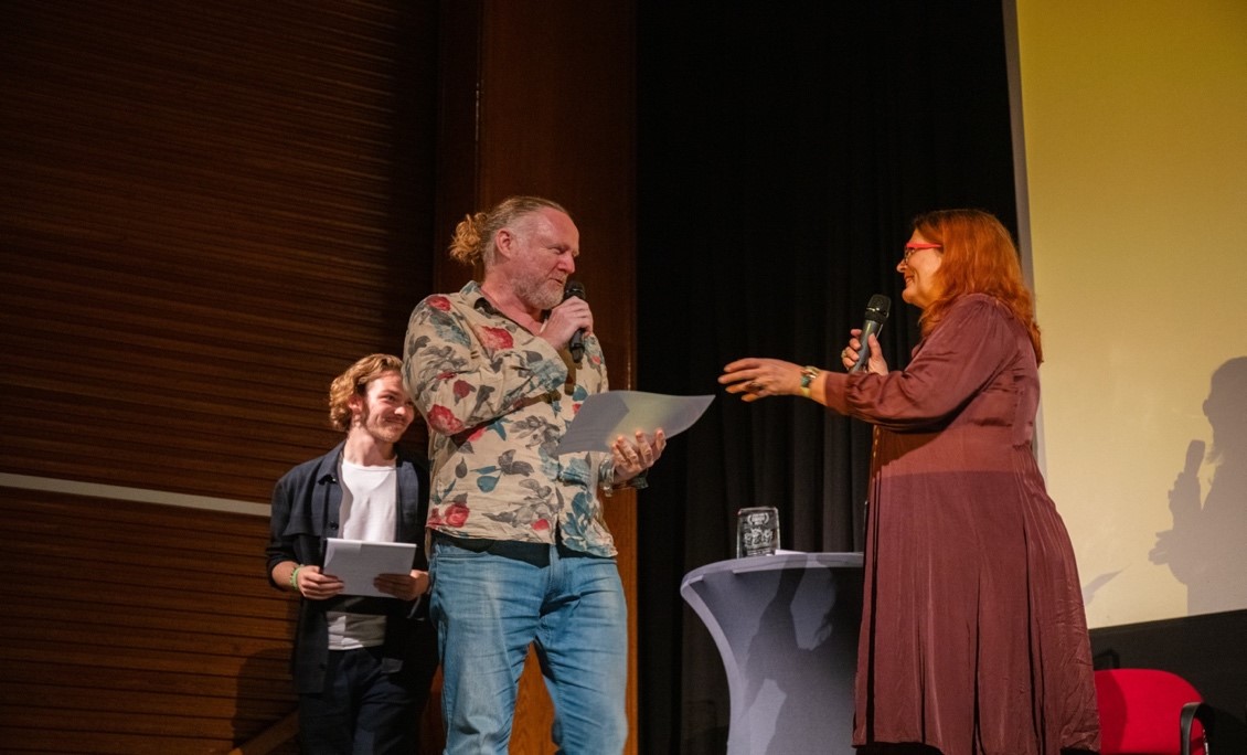 Cenu diváka v kategórii CINEDU Teens preberá od riaditeľky festivalu Ľudmily Cvikovej scenárista filmu John Chambers, vpravo moderátor večera herec Oliver Asztalos