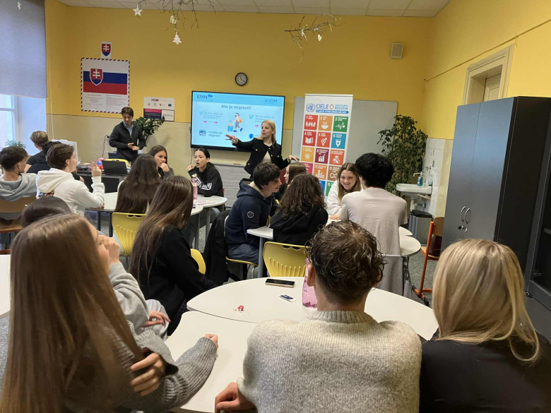 Študenti Obchodnej akadémie v Leviciach sa dňa 2.12.2025 zúčastnili odbornej prednášky o OSN a do simulačného workshopu o migrácii "Cieľ Európa" pod vedením IOM. Po prednáške o cieľoch, zložení a prínose OSN mali študenti možnosť hlbšie preniknúť do problematiky migrácie a získať ucelený prehľad základných pojmov, typov migrácie i dynamicky sa meniaceho globálneho kontextu. Pani Tatiana Zlatos, pracovníčka IOM im vysvetlila aktuálne trendy na Slovensku, v Európskej únii aj vo svete, ako aj politické nástroje a mechanizmy, ktoré ovplyvňujú pohyb ľudí naprieč hranicami. Prednáška im umožnila pochopiť migráciu nielen ako súbor štatistík či procesov, ale aj ako komplexný spoločenský jav so širokým dopadom na jednotlivcov, komunity a krajiny.